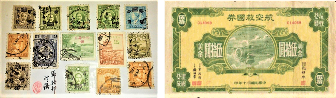 邓锡邦是个收藏家,他保存有古代名画和民国时期的各种邮票,还有在抗战时由国民政府所发行的50美元面值的航空救国券。抗战初期,国民政府设立“中国航空委员会”来募款购买飞机,扩大中国空军。由财政部发行的“